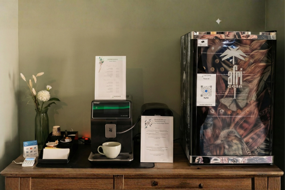 Unsere Self-Service Mini-Bar ermöglicht Ihnen eine einfache und flexible Selbstbedienung am Kühlschrank oder an der Kaffeemaschine, ganz unabhängig von festen Zeiten. Die Abrechnung erfolgt anschließend unkompliziert per PayPal oder EC-Terminal und basiert bewusst auf Vertrauen und Eigenverantwortung, sodass Sie Ihren Aufenthalt entspannt genießen können.